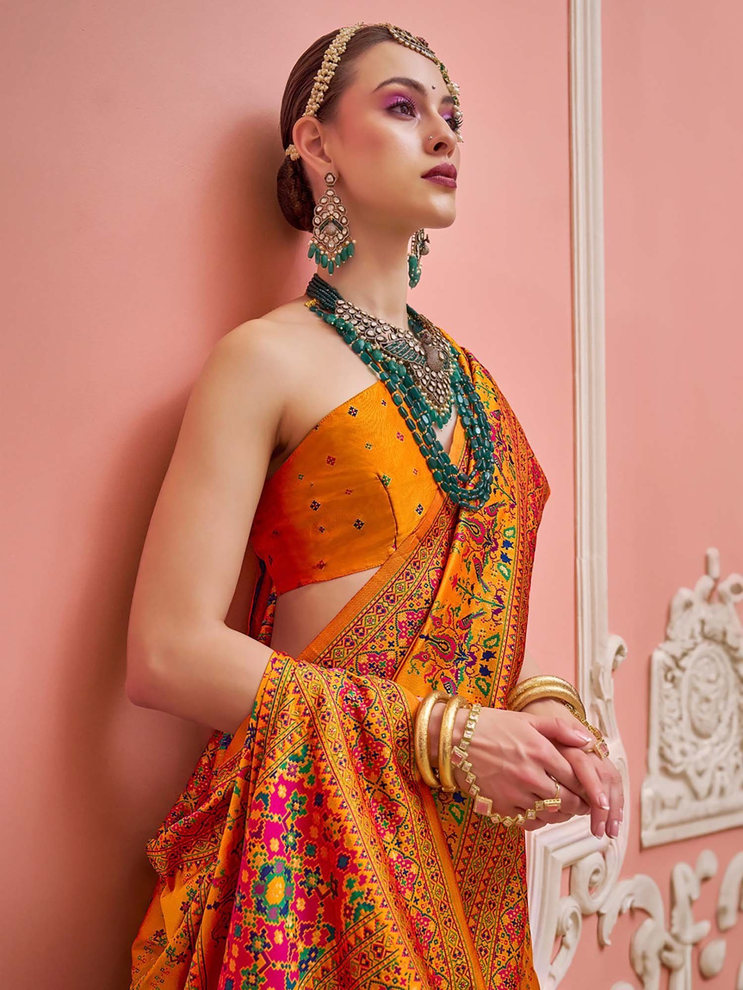 Womens Silk Blend Yellow Woven Design Saree with Unstitched Blouse